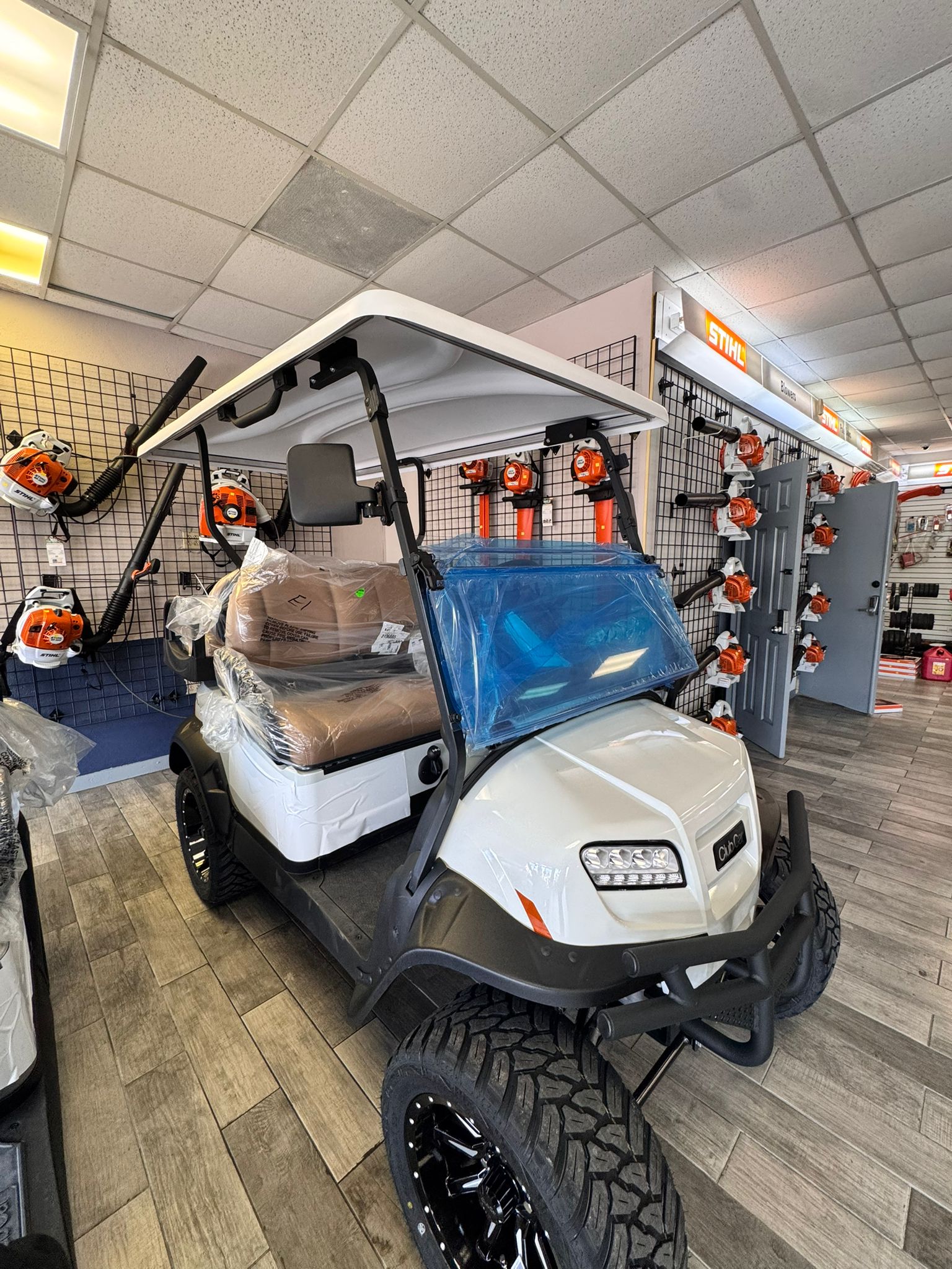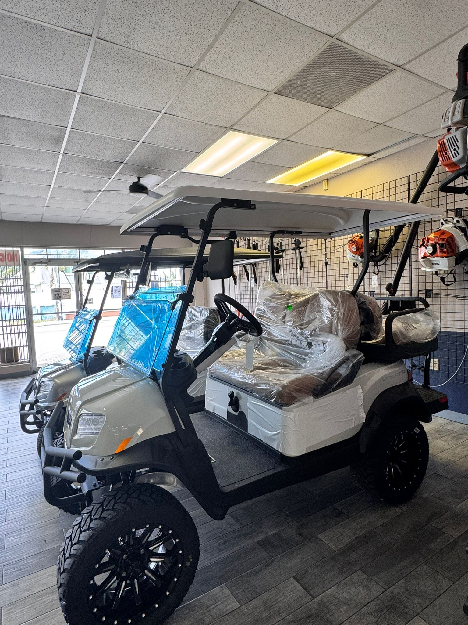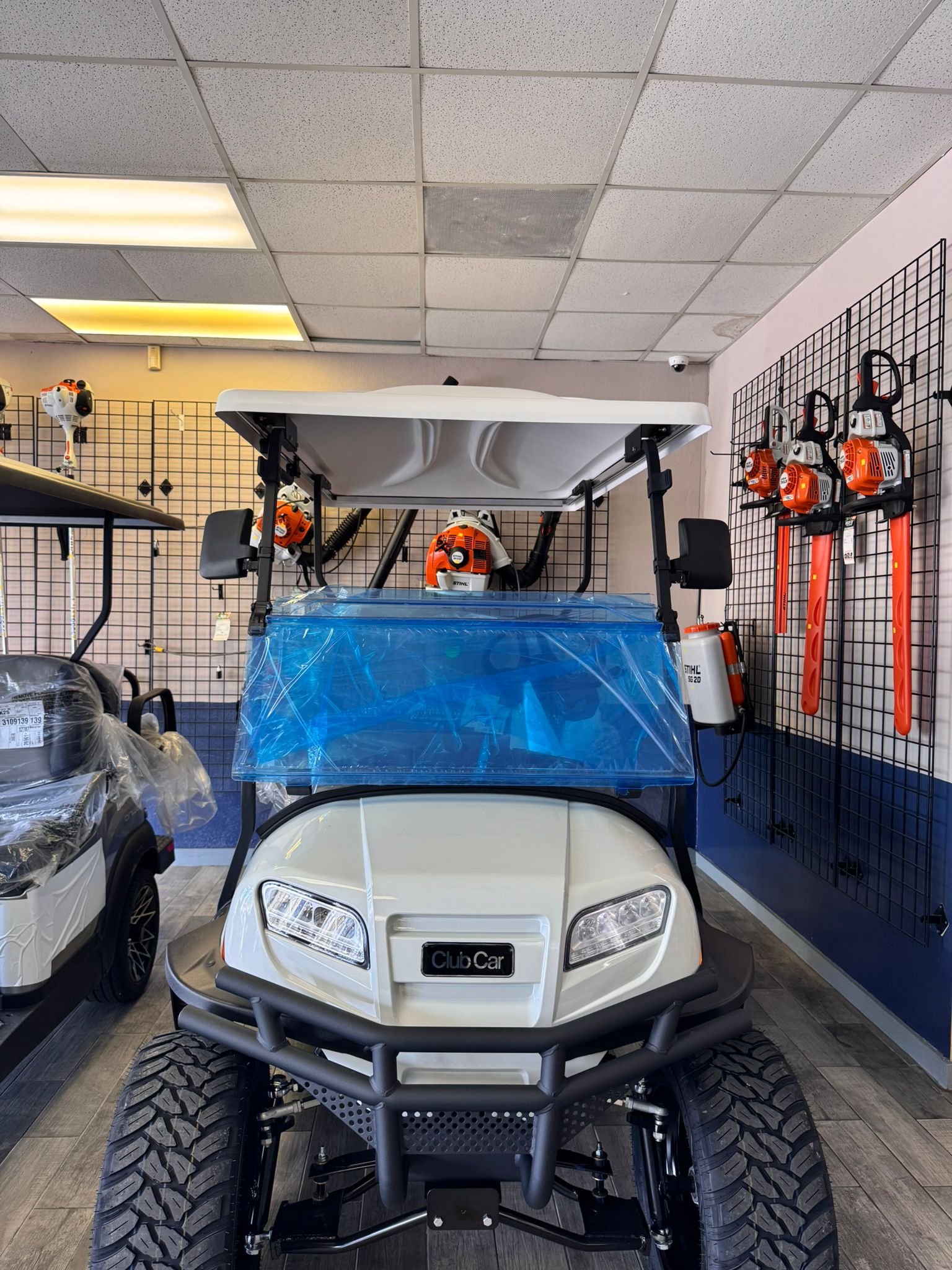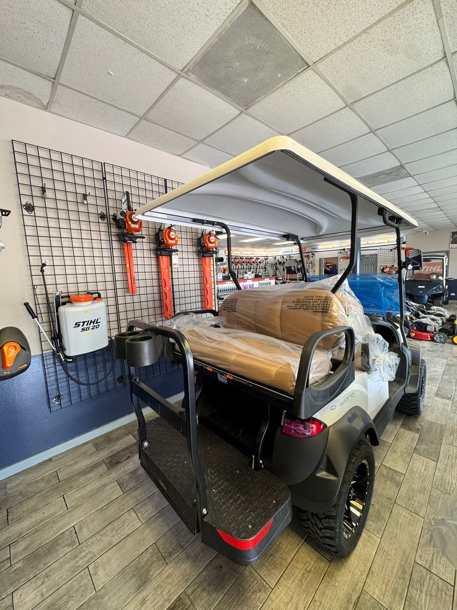 2027 Club Car ONWARD 4 Passenger Gas powered – Lifted Personal Transportation Vehicle ( PTV) following standard equipment included : LED Deluxe Lighting Pkg., Heavy Duty SuspensionDC Converter,14″ Alloy Wheel – Mercury Style w/ A.T. Tires, Soft Comf. Grip Steering Wheel, 19mph, Fuel Gauge, Fold-down Rear Seat Included.
